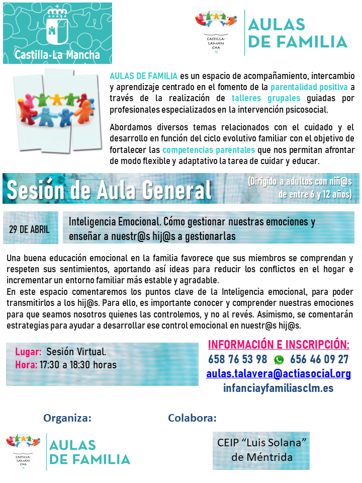 Desde el Colegio queremos seguir haciéndoos llegar actividades y recursos para facilitaros la tarea en casa en estos difíciles momentos. Para ello, esta vez hemos contado con un recurso de la Junta de Comunidades de Castilla La Mancha que ofrece formación específica a las familias sobre distintos temas de interés. Esta formación es impartida por un equipo de expertos (psicólogos y trabajadores sociales). En este caso, hemos seleccionado una sesión sobre Inteligencia Emocional, un aspecto especialmente importante en esta situación. Para participar en ella, sólo tenéis que inscribiros en el siguiente enlace y el equipo de Aula de Familias contactará con vosotros para facilitaros el acceso a una plataforma virtual en línea en la que tendréis un trato directo con ellos y otras familias participantes.