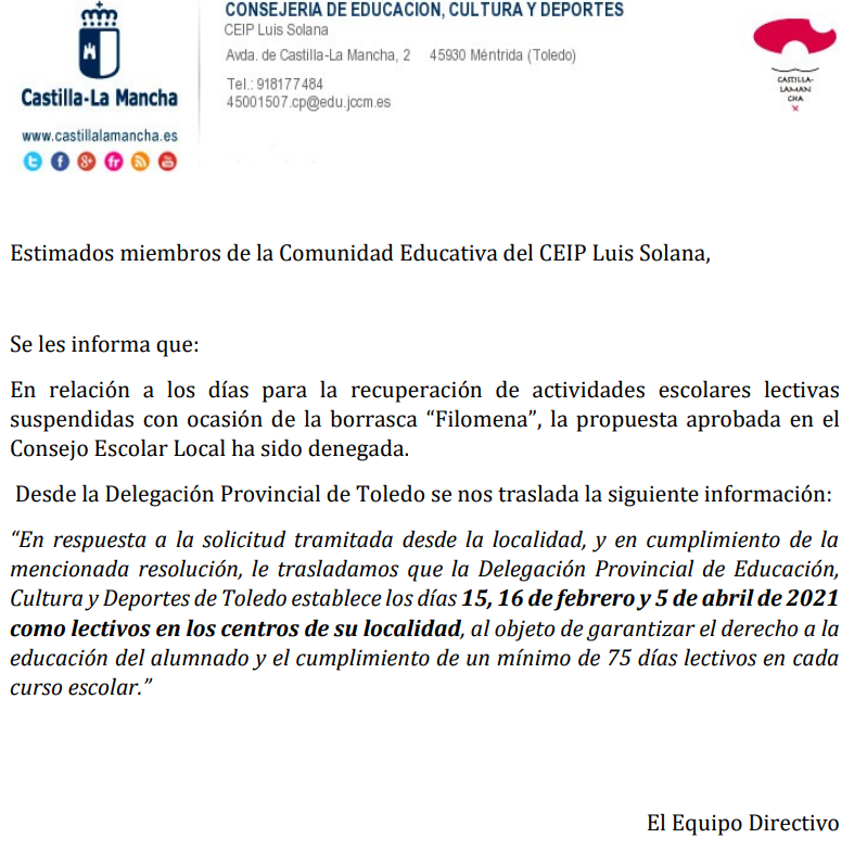 MODIFICACIÓN CALENDARIO ESCOLAR