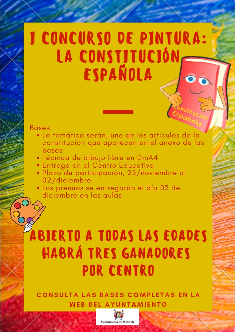 Desde la Concejalía de “Cultura y Festejos” del Ayuntamiento de Méntrida, con el objetivo de celebrar el 6 de diciembre, día de la Constitución Española, se desarrollará el “I Concurso de pintura. La Constitución”: