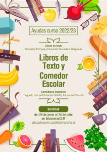 Hoy 23 de junio se ha publicado en el DOCM la Resolución de 21/06/2022 de la Consejería de Educación, Cultura y Deportes por la que se publica la Convocatoria de Ayudas consistentes en el uso de libros de texto y de comedor escolar alumnado matriculado en centros sostenidos con fondos públicos de Castilla-La Mancha. Curso 2022/2023.