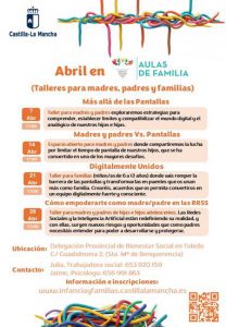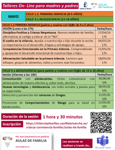 Las personas interesadas pueden inscribirse en https://infanciayfamilias.castillalamancha.es/crianza-convivencia-familiar/aulas-de-familia . Para la inscripción en la nueva modalidad de Aulas, no hace falta filtrar por etapa evolutiva en la web.